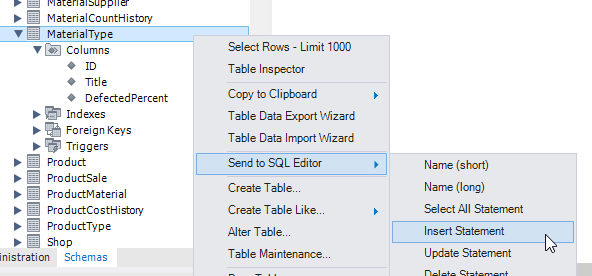 в контекстном меню таблицы MaterialType выбираем "Send to SQL Editor" -> "Insert Statement"