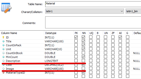 По структуре таблицы Material видно, что одно поле словарное (MaterialTypeID)