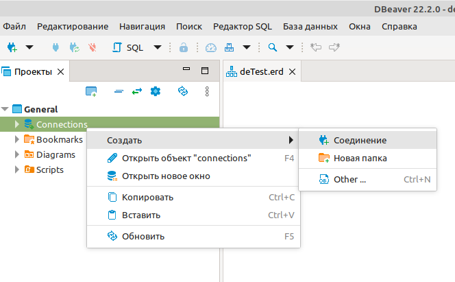 В списке проектов открываем пункт General и в контекстном меню пункта Connections выбираем Создать -> Соединение