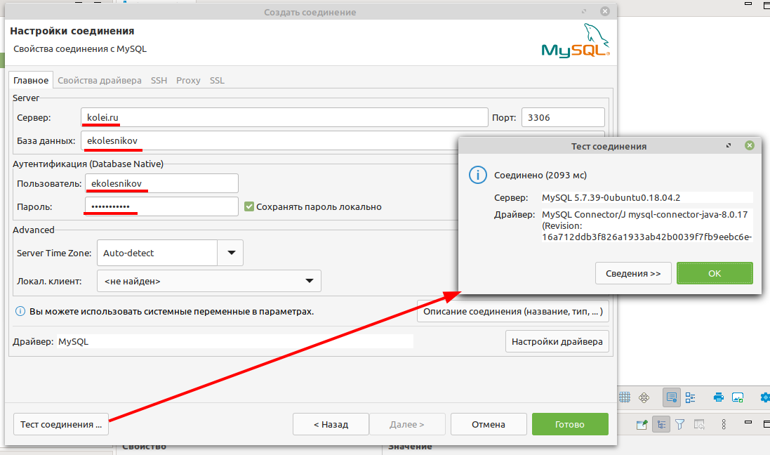 Затем нажимаете тест соединения и, если всё введено правильно, и соединение устанавливается то жмёте Готово