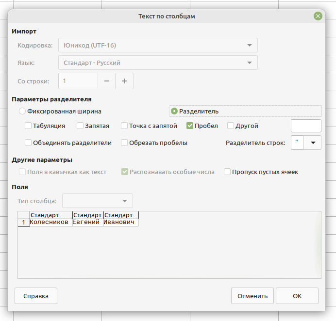 разделение составных полей (часто ФИО в файле передаётся одним полем, а в структуре БД разбито на отдельные поля) на примере LibreOffice Calc