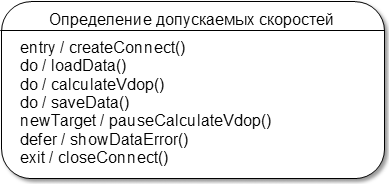 do (англ. – выполнять) – деятельность в состоянии. Находясь в состоянии, экземпляр сущности может бездействовать и ждать наступления некоторого события, а может выполнять длительную операцию. Например, рассчитать допускаемые скорости do / calculateVdop(). Допускается указывать несколько операций в виде отдельных строк, каждая из которых начинается с метки «do», или в виде одной строки, операции в которой отделены друг от друга точкой с запятой.