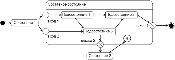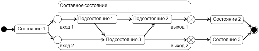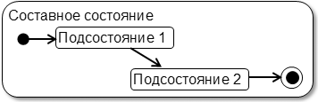 Помимо простых состояний (англ. simple state), изображенных выше, на диаграмме могут отображаться составные состояния (англ. composite state), состоящие из вложенных в них подсостояний (англ. substate).