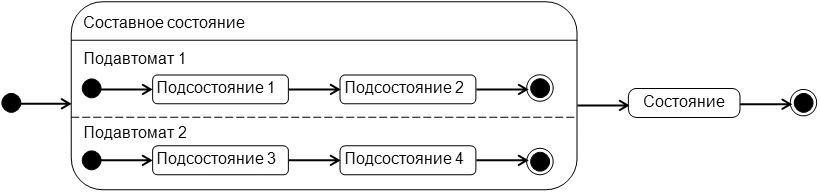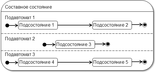 Составное состояние, которое может использоваться в разных контекстах, в т.ч. и для разных диаграмм (автоматов), называются подавтоматами (англ. submachine state). Составное состояние может быть разбито на зоны (англ. regions), называемые также параллельными подавтоматами (англ. concurrent substates). Если на диаграмме имеется составное состояние с вложенными параллельными подавтоматами, то экземпляр сущности может одновременно находиться в нескольких подсостояниях, но не более чем по одному из каждого подавтомата. Если какой-либо из подавтоматов пришел в свое конечное состояние раньше других, то он должен ожидать, пока другие подавтоматы не придут в свои конечные состояния.