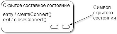 В некоторых случаях бывает желательно скрыть внутреннюю структуру составного состояния в целях улучшения восприятия диаграммы. В подобной ситуации в правом нижнем углу указывается специальный символ, означающий, что структуру состояния можно посмотреть на отдельной диаграмме.