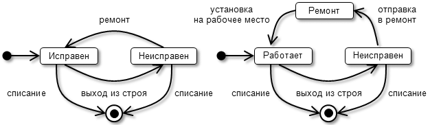 Наличие у экземпляра сущности нескольких состояний, отличающихся от простой схемы «исправен – неисправен» или «активен – неактивен», служит признаком необходимости построения диаграммы автоматов. При выделении состояний и переходов следует помнить, что длительность срабатывания переходов должна быть существенно меньшей, чем нахождение моделируемого объекта в соответствующих состояниях. Каждое из состояний должно характеризоваться определенной устойчивостью во времени. Так, на рисунке ниже при моделировании поведения технического устройства, в простейшем случае, можно выделить два или три состояния. При этом в одном случае ремонт показан в качестве перехода, т.е. считается, что занимает мало времени, а в другом – в качестве состояния, что больше соответствует реалиям жизни.