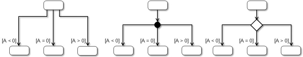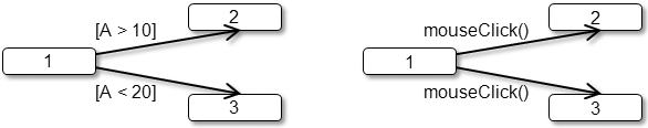 В каждый момент времени автомат или подавтомат должен находиться только в одном состоянии. Это означает, что спецификация переходов из одного состояния не должна допускать потенциальной возможности перехода в два и более состояний. На следующем рисунке приведены примеры фрагментов диаграмм с конфликтными переходами.