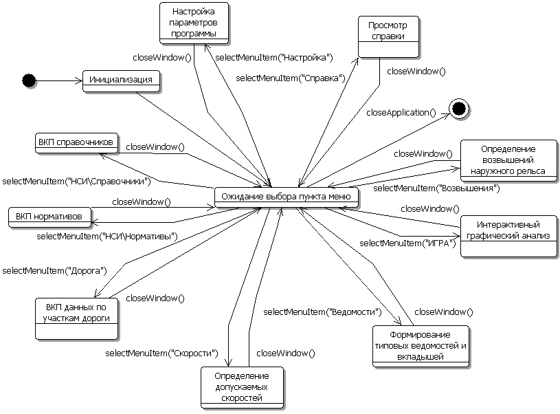 При запуске программы вначале осуществляется ее инициализация (чтение текущих настроек и отображение основного окна программы). Далее программа автоматически (по нетриггерному переходу) оказывается в состоянии ожидания выбора пункта меню. После выбора пункта меню осуществляется отображение соответствующего диалогового окна на экране, выполнение необходимых действий (как правило, в интерактивном режиме) и закрытие окна с возвратом в исходное состояние.