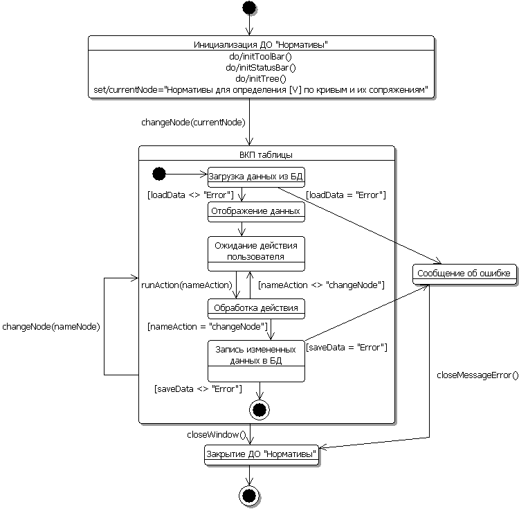 При выборе пункта меню «Нормативы» на экране отображается соответствующее диалоговое окно. В момент инициализации создаются панель инструментов initToolBar(), строка сообщений initStatusBar() и дерево с наименованиями таблиц в левой части диалогового окна initTree(). Исходным выбранным узлом дерева устанавливаются «Нормативы для определения [V] по кривым и их сопряжениям». При выборе узла дерева changeNode(), связанного с таблицей, система выполняет стандартные операции, начиная от загрузки данных, непосредственной обработки действий пользователя runAction() с таблицей или ее полями (редактирование значений, вставка новой записи, удаление записи, печать таблицы и т. д.) и заканчивая сохранением в базе всех измененных данных. Если в момент загрузки или записи данных возникает ошибка, то на экране отображается соответствующее сообщение. Закрытие окна «Нормативы» предусмотрено после закрытия сообщения об ошибке closeMessageError() или в результате стандартного действия пользователя closeWindow().