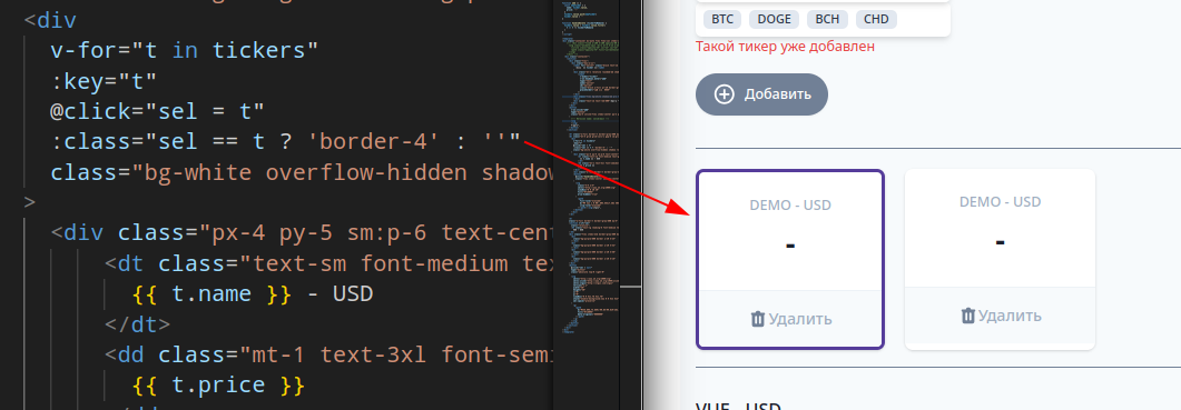 При добавлении новой валюты (функция add) запускаем таймер, который раз в 3 секунды будет запрашивать данные от АПИ (ключ из видео пока работает, но если что - зарегистрируйтесь). При получении данных они записываются в подходящий элемент массива (ищет по имени валюты). Тут возник вопрос к реактивности, который отложили на потом