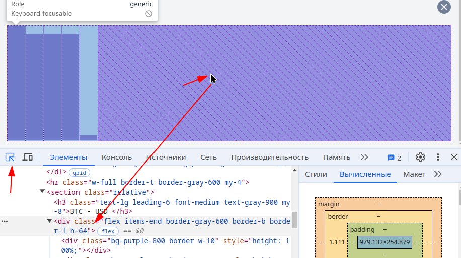 Активируем кнопку "Выбрать элемент", кликаем мышкой на элемент, который нам интересен (блок с графиком) и в окне элементов будет выделен элемент вёрстки, который соответствует "картинке"