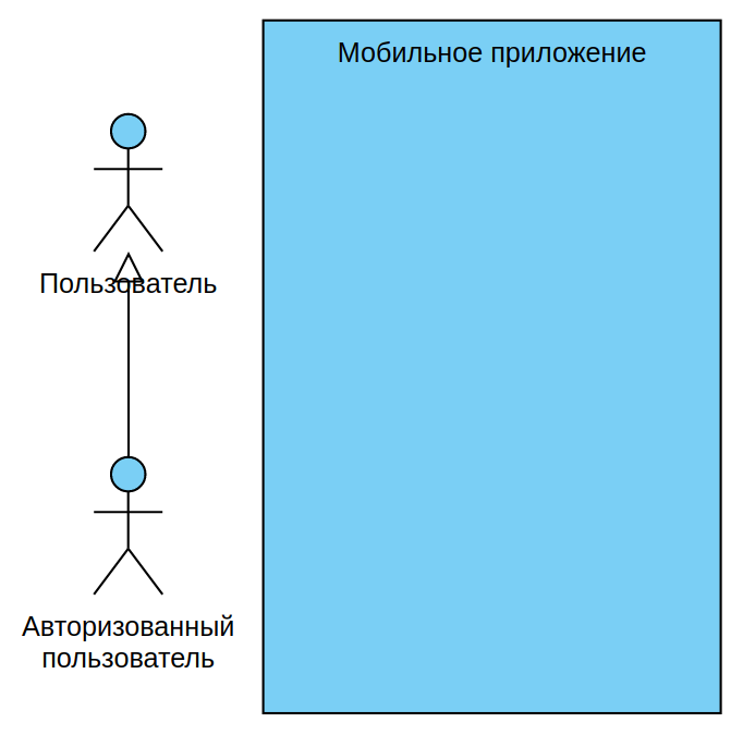 В нашей системе это обычный пользователь и авторизованный пользователь. Рисуем их рядом с нашей подсистемой, причём учитываем, что авторизованный пользователь наследует (обобщает) свойства обычного пользователя (может прикрепить карту) и рисуем связь "обобщение":