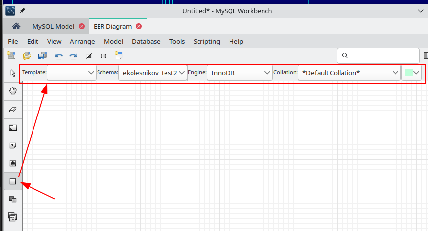 Переименуйте модель. Название модели будет использоваться в DDL-скрипте как название базы данных, поэтому название должно соответствовать задаче: например, ekolesnikov_test для лабораторных работ и user01 при выполнени демо-экзамена (если у вас еще нет аккаунта для подключения к БД, то можете этот шаг пропустить).